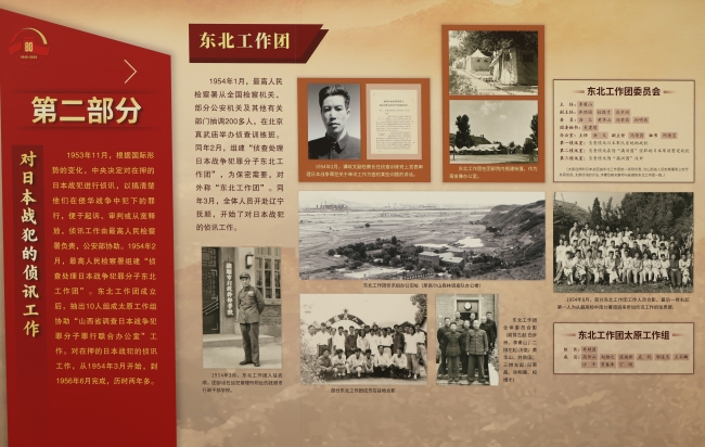 1945年9月2日,日本签署投降书,中国人民抗日战争暨世界反法西斯战争取得伟大胜利。包括一些首要战犯在内的部分日本战犯,战后已由远东国际军事法庭作出处理。其余日本战犯的审判工作,由中国根据《中美英三国促令日本投降之波茨坦公告》精神处理。新中国成立后,最高人民检察署全面负责对在押日本战犯的侦查起诉工作。展览从新中国处理日本战犯的历史背景、对日本战犯的侦讯工作、出席特别军事法庭支持公诉、对部分日本战犯免予起诉、铭记历史开创未来5个部分,通过详实的史料和影像资料,详细介绍了新中国检察机关侦查起诉日本战犯的历史,再一次证明对日本战犯审判的正义性质是不可动摇、不容挑战的。